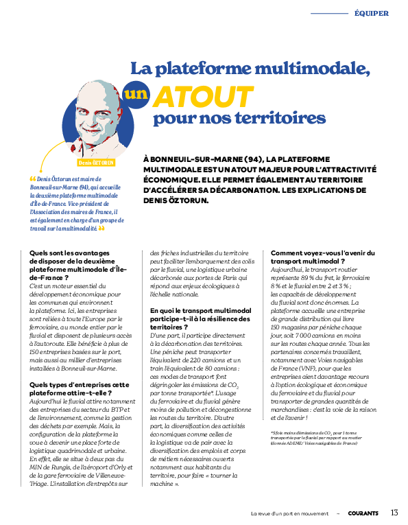 Article paru dans le magazine semestriel, Courants par HAROPA PORT sur la multimodalité, avec une interview du maire Denis Öztorun.